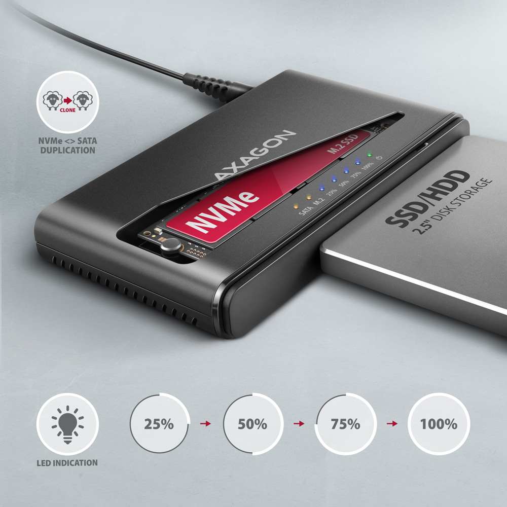 AXAGON ADSA-CC USB-C 10Gbps - NVMe M.2 SSD & SATA 2.5"/3.5" SSD/HDD CLONE MASTER 2 adaptér