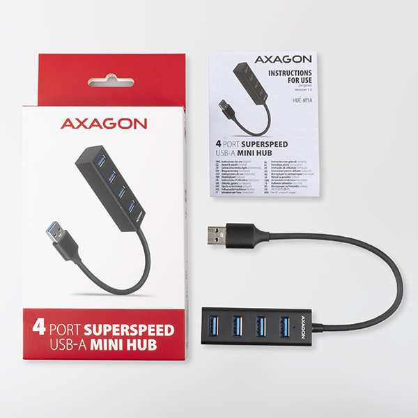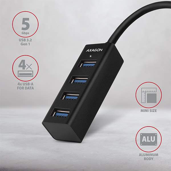 AXAGON HUE-M1A, 4x USB 3.2 Gen 1 MINI hub, kovový, kabel USB-A 20cm