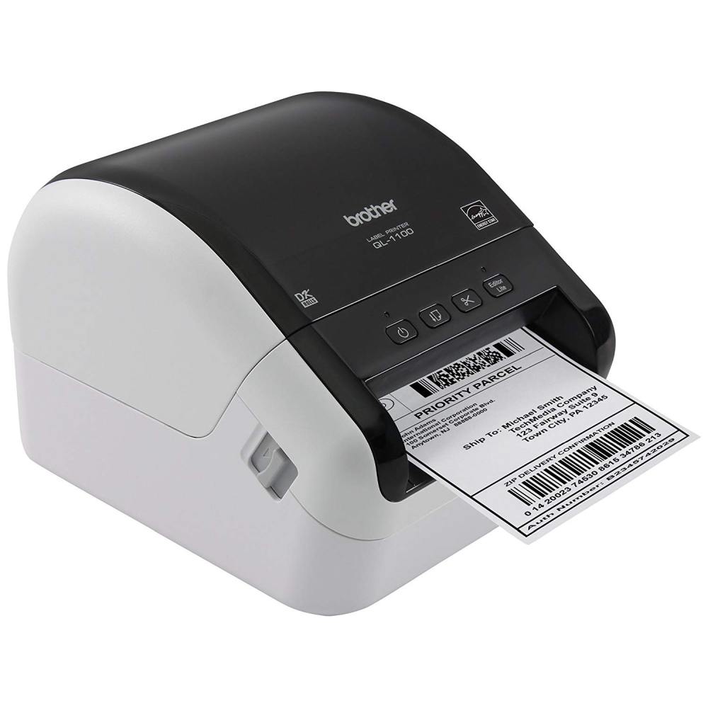 Tiskárna na papírové samolepící štítky nebo filmové role s automatickým odstřihem a šířkou tisku až 102 mm. Tento přístroj je možné použít pouze se spotřebním materiálem společnosti Brother (DK role / štítky). Šířka tisku 4” (101,6 mm) Integrovaný pro