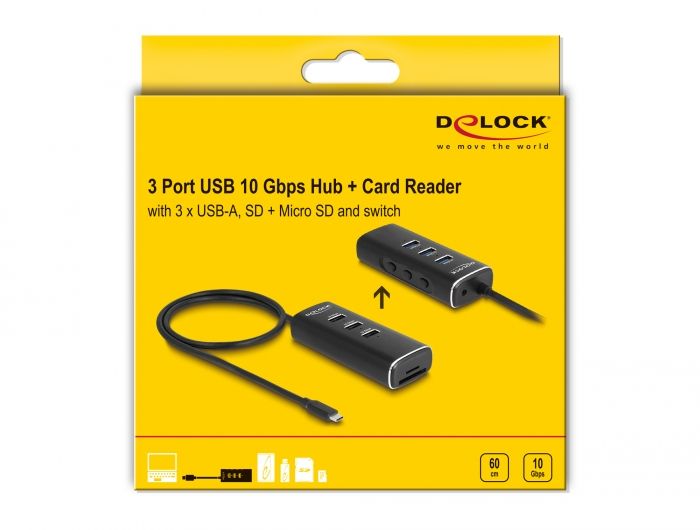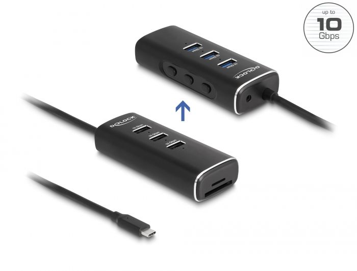Delock 3 portový rozbočovač USB 10 Gbps obsahující čtečku karet SD a Micro SD s konektorem USB Type-C™