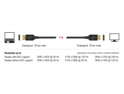 Tento certifikovaný kabel DisplayPort od Delocku se používá pro připojení zařízení s rozhraním DisplayPort, jako jsou monitory, projektory nebo televize, k PC nebo notebooku. Podporuje maximální šířku pásma 32,4 Gb/s, obsah může být zobrazen v rozlišení 8K Ultra HD (7680 x 4320 @ 60 Hz) resp. 5K (5120 x 2880 @ 120 Hz) a 4K Ultra HD (3840 x 2160 @ 240 Hz). Vysoce kvalitní trojitý kabel take výrazně zlepšuje kvalitu přenosu zvuku se vzorkovací frekvencí až do 1536 kHz.