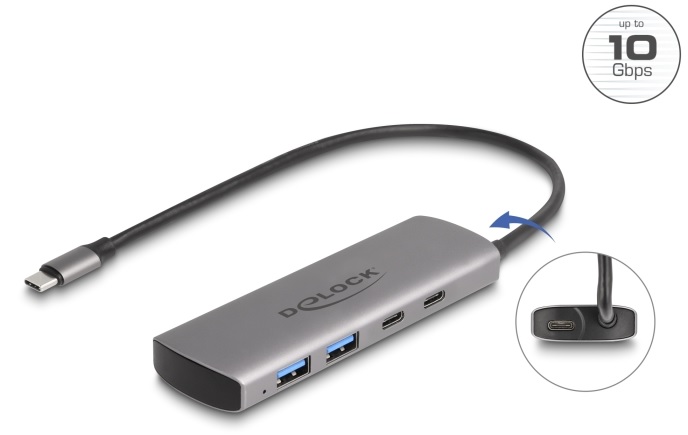 Delock Hub USB 10 Gbps se 2 porty USB Typ-A + 2 porty USB Type-C™ s konektorem USB Type-C™ a s dalším napájecím portem