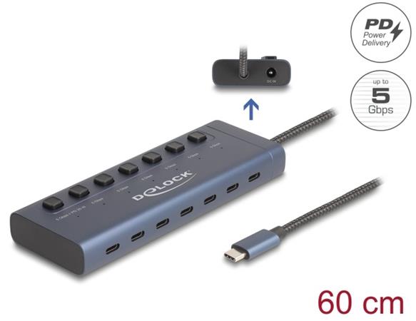Delock USB 5 Gbps Hub se 7 porty USB Type-C™ se spínačem, z nichž 6 x datové porty a 1 x datový port s napájecím výkone