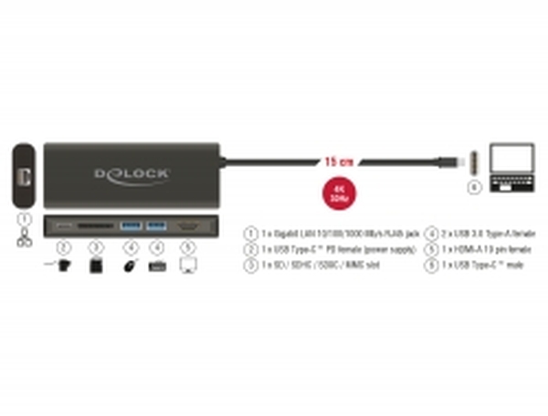 Delock USB Type-C™ 3.1 dokovací stanice HDMI 4K 30 Hz, Gigabit LAN a funkce USB PD