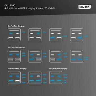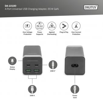 Digitus 4portový nabíjecí adaptér USB, 65W GaN 65W, 2x USB-C, 2x USB-A, PD3.0 Vysoce výkonný 4portový nabíjecí adaptér GaN s výstupem až 65 W pro zařízení USB-C/USB-A všeho druhu Kompaktní nabíječka pro zařízení, jako jsou notebooky, smartphony nebo