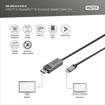 Obousměrný kabel adaptéru DIGITUS® USB Type C <=> DisplayPort podporuje přenos ze zdroje USB typu C do rozhraní DisplayPort. Stejně tak podporuje přenos ze zdroje DisplayPort do rozhraní USB typu C. Můžete například připojit notebook (vybavený rozhraním USB Type-C) k monitoru, televizoru nebo projektoru (rozhraní DisplayPort) nebo můžete připojit počítač (výstup DisplayPort) k monitoru (rozhraní USB Type-C). Napájení je napájeno přes USB port, takže není potřeba žádný externí zdroj napájení.