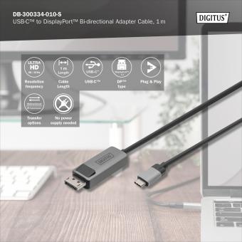Obousměrný kabel adaptéru DIGITUS® USB Type C <=> DisplayPort podporuje přenos ze zdroje USB typu C do rozhraní DisplayPort. Stejně tak podporuje přenos ze zdroje DisplayPort do rozhraní USB typu C. Můžete například připojit notebook (vybavený rozhraním USB Type-C) k monitoru, televizoru nebo projektoru (rozhraní DisplayPort) nebo můžete připojit počítač (výstup DisplayPort) k monitoru (rozhraní USB Type-C). Napájení je napájeno přes USB port, takže není potřeba žádný externí zdroj napájení.