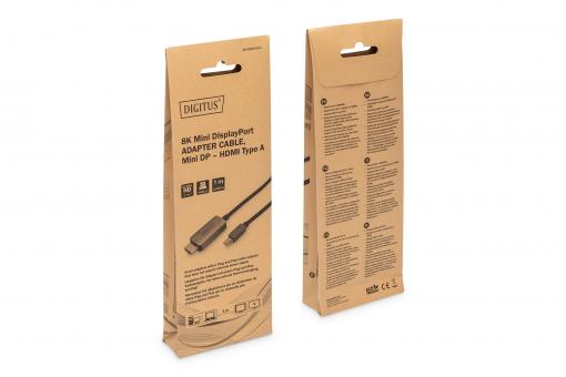 Digitus 8K@60Hz. M/M; mini DP na HDMI; kabeový adaptér Alu Pouzdro; Černý; 1m