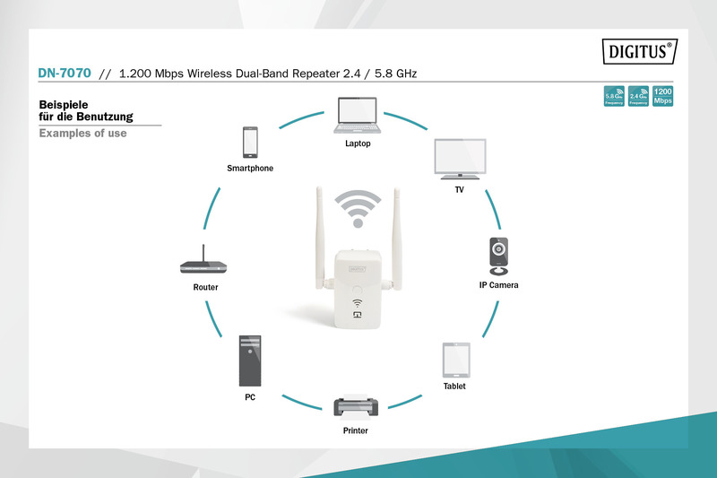 Description 1200 Mbps Wireless Repeater 2.4/5.8 GHz, WPS Extend your WiFi network by this wireless dual band repeater via WPS push button. Extend your WiFi network individually 2 external omni-directional WiFi antennas provide first class signals to y