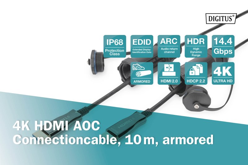 DIGITUS Připojovací kabel 4K HDMI AOC, ochranný kryt pro zástrčky IP 68; 10 m, 4K*2K@60HZ