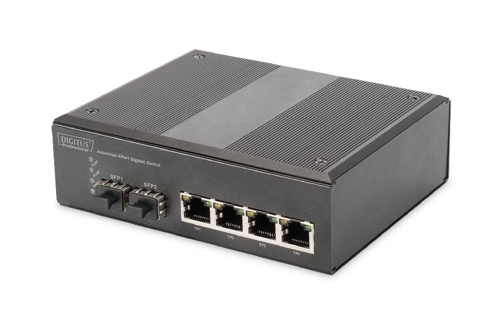 Industrial 4-Port Gigabit Switch with 2 x SFP uplink 4 x 10/100/1000Base-TX Ethernet Ports 2 x 1000Base-X SFP Uplink Ports The DIGITUS® Industrial Gigabit Switch is designed for harsh environments, where it is exposed to moisture, temperature fluctuations, and vibrations. With a temperature range of -40°C to 85°C, the Industrial Gigabit Switch can be used under the most adverse conditions. It ensures a constant availability in highly sensitive areas such as transport, production, traffic and safety monitoring. The simple plug and play system allows the Industrial Gigabit Switch to be quickly integrated into the respective environment. With its Gigabit connectivity and SFP Uplink Ports, the Industrial Gigabit Switch is a flexible, cost-effective solution for the industrial environment.