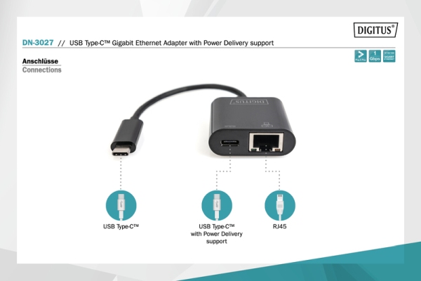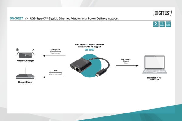 Description USB-Type-C Gigabit Ethernet Adapter + PD with power delivery function Extend your laptop with USB-C™ port to a Gigabit network connection with Power Delivery support Up to 1000 Mbps transfer rate for super-fast Internet access Easy to