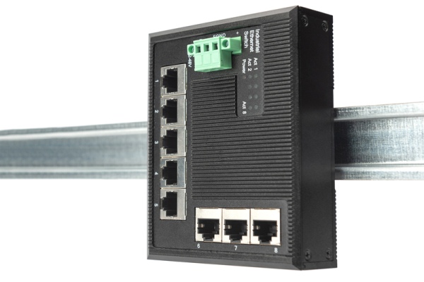 Průmyslový 5-portový gigabitový plochý přepínač 5 portů, DIN lišta, prodloužená teplota. rozsah Robustní průmyslové řešení, vysoký teplotní rozsah, ploché pouzdro šetřící místo pro montáž na profilové kolejnice Průmyslový přepínač Ethernet má 5 port