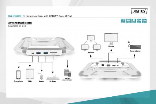 DIGITUS variabilní stojan na notebook s integrovanou dokovací stanicí USB-C ™, 8 portů