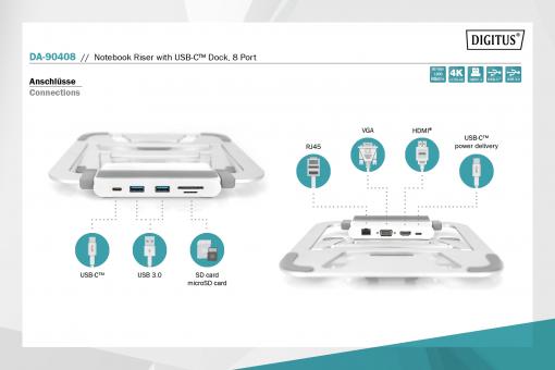 Nastavitelný stojan na notebook od DIGITUS® kombinuje ergonomický design a možnosti připojení v jedné praktické jednotce. Úhel sklonu můžete snadno přizpůsobit své výšce ve 4 úrovních. Váš notebook lze připojit přes port USB-C ™, což vám umožní přístup ke všem rozhraním integrované dokovací stanice. Na přední straně je plně funkční port USB-C ™, dva porty USB A (USB 3.0) a čtečka karet pro karty SD a microSD. Na zadní straně je možné připojit dva monitory (HDMI + VGA), síťový kabel RJ45 (LAN) a napájecí adaptér USB-C ™, který umožňuje nabíjení (Power Delivery) pro zařízení, jako je připojený notebook . Využijte výhody ergonomického designu a konektivity v jedné jednotce se stojanem na notebook DIGITUS® s integrovanou dokovací stanicí.