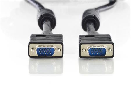 Reduces external interferences and allows a good signal transference. For connection of a PC, for example, with a monitor or beamer /projector. l 3 x Coax for RGB and 7 x AWG28 signal wires l Connector 1: HD DSUB, 15-pin, plug l Connector 2: HD DSUB, 15-pin, plug l Cable type: 3Coax + 7-wire l Hoods: molded l Shielding: Double shielding l AWG: 28 l Wire material: CU l Connector surface: nickel-plated l Ferrite filter: 2 x ferrite beads l Color cable: black l Color connector: black l Length: 15 m l Assortment: VGA Cables