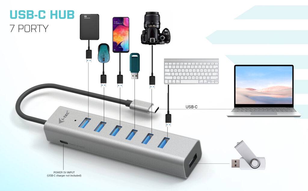 I-tec USB-C Charging Metal HUB 7 Port USB-C, USB4 a ThunderboltTM 3 či 4 jsou na dnešních noteboocích a tabletech čím dál populárnější. Společně s jejich čím dál širším využívání ubývá na těle notebooků množství USB portů. A pokud potřebujete připojit