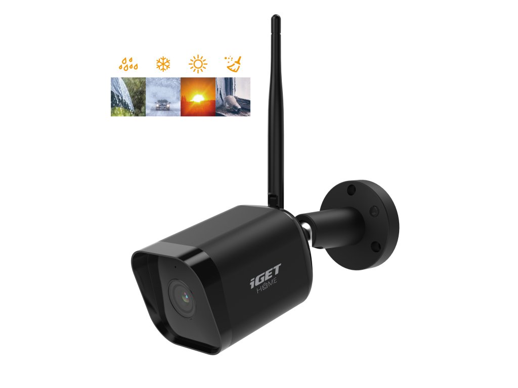 Venkovní odolná IP kamera s online sledováním pomocí aplikace iGET HOME na mobilním telefonu, tabletu, apod. Kamera disponuje obousměrným přenosem zvuku - obsahuje mikrofon i reproduktor. Ukládání záznamů a fotografií na microSD kartu (až 128 GB) nebo Cloud. Rozlišení FullHD 1080p (1920 x 1080) pro video ve vysoké kvalitě, denní i noční provoz, snímač 1/2,9" CMOS, komprese videa H.264, IR přisvětlení až 10 m, ohnisková vzdálenost 3 mm, Wi-Fi 802.11b/g/n, odolnost proti prachu a vodě IP65. Napájecí kabel 4m, kovový držák.