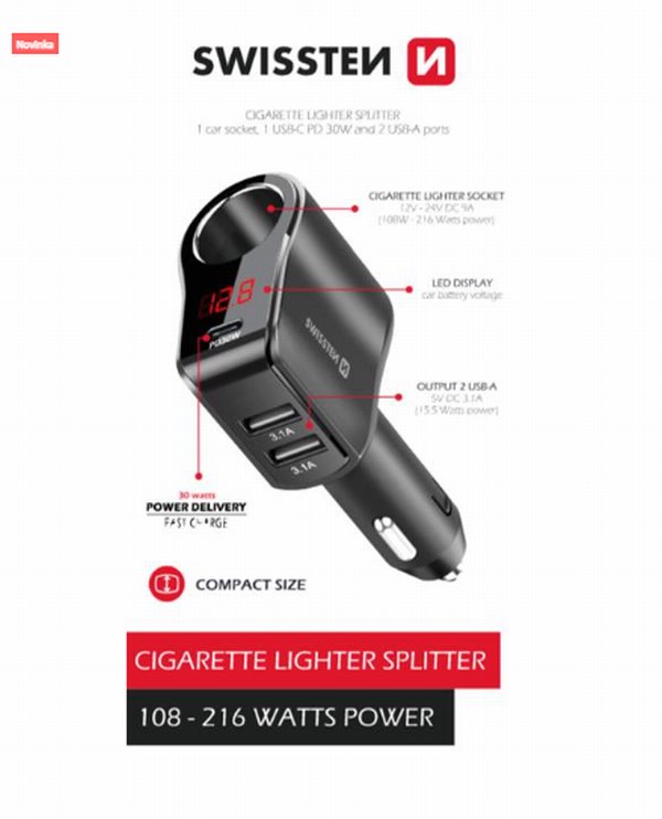 Kvalitně zpracovaný CL adaptér do zapalovače s výstupy 1xCL, 1xUSB-C PD, 2xUSB-A. Baleno v blistru Swissten.