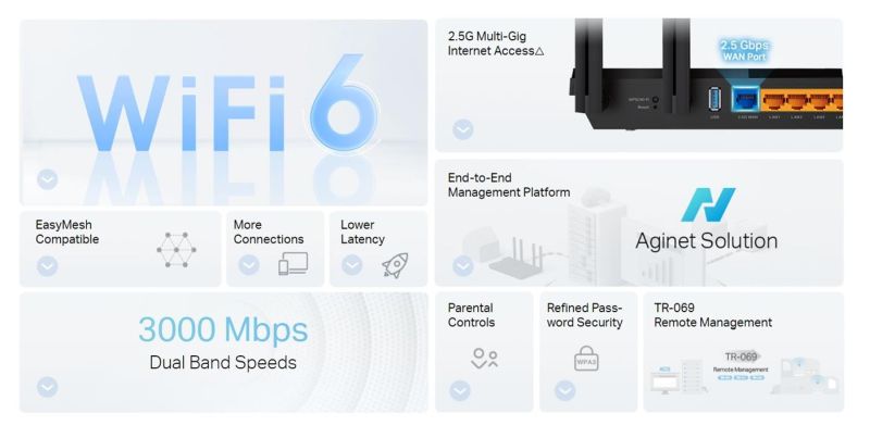 AX3000 Multi-Gigabit Wi-Fi 6 Router Aginet řešení: Koncová platforma pro ISP Řešení Aginet nabízí pro ISP výkonnou a flexibilní platformu pro správu více zařízení v domácnosti. Dynamické poskytování služeb, zero-touch upgrade firmwaru a vzdálené řešení