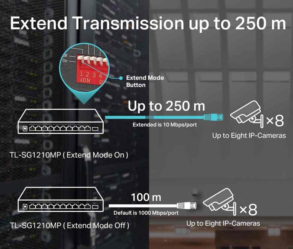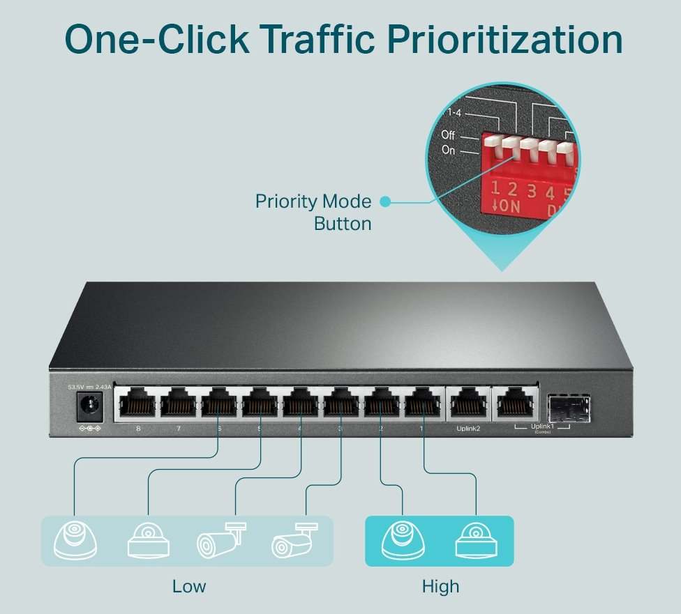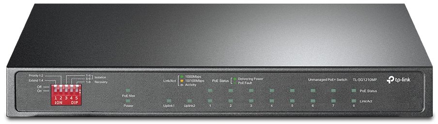 TP-Link TL-SG1210MP je Gigabitový desktopový hloupý (nemanagovatelný) switch v odolném kovovém šasi s 10x Gigabit LAN a jedním combo SFP, z čehož 8 ethernetových portů podporuje i PoE out 802.3af/at pro napájení kamer, access pointů a podobných zařízení